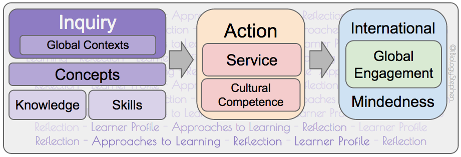 In the greater context, we have been framing the value of the Global Contexts recently as the driving force in the MYP that makes a good backwards-designed curriculum into an authentic and explicitly international education. Through knowledge and skills students develop conceptual understandings, which the global contexts help us to shape into meaningful, pragmatic inquiry (critical, reflective, consequence-oriented thought), resulting in action (including service), leading to international mindedness (a state of mind) and global engagement (behaviours). Meaningful action arises in conjunction with cultural competence. Through all this, we hope to develop the IMaGE of our learners.