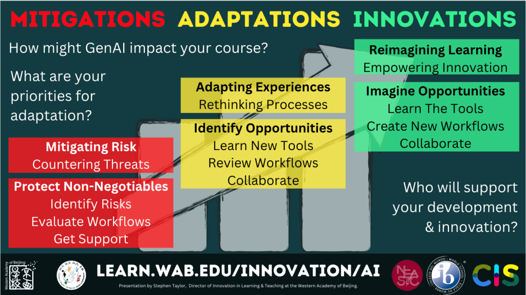 Another big investment in time and energy over the last couple of years has been running our IB-NEASC Collaborative Learning Protocol and CIS Deep Dive reaccreditation pathways. Something of interest in these has been NEASC’s 4C’s model for innovation/change, and so here’s my interpretation of that in light of adapting to GenAI in schools: