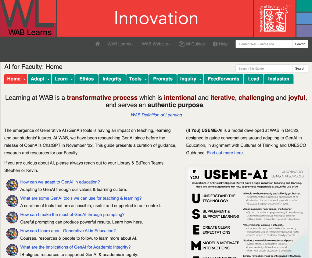 As GenAI tools and discussions developed, play was essential. What could they do? Could it be useful? Were they appropriate? I kept a mega-thread of experiments from Oct’22-Jul’23 (scroll back) and we connected with others online in sharing our learning. Noticing that culture would be more important in a school’s adaptations to GenAI than policy or tech tools, and seeing reactions ranging from ‘ban it’ to potentially unsafe uses, I created (If You) USEME-AI in Dec’22, as a frame for thinking through issues and adaptations. Our team created concise introductions for colleagues and we held some interesting sessions with parents to consider our approaches.
