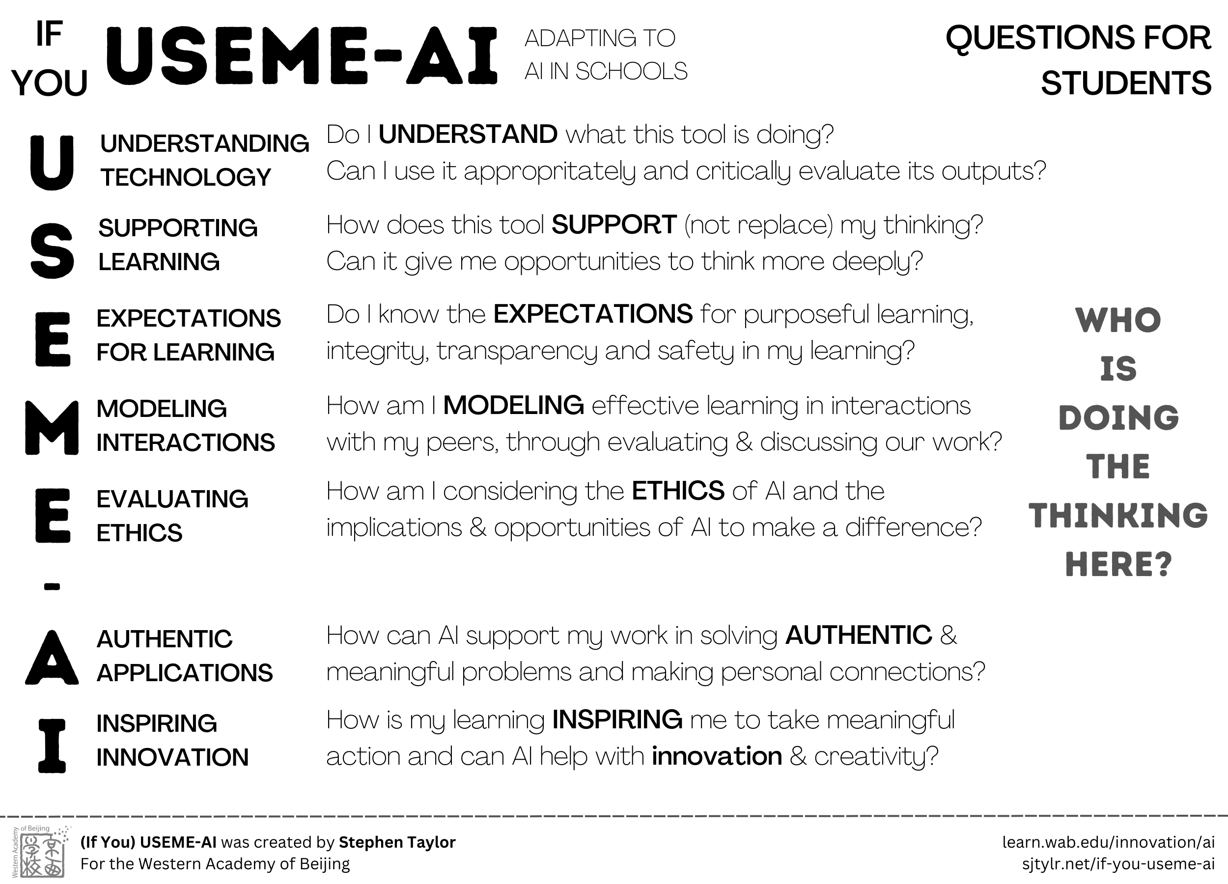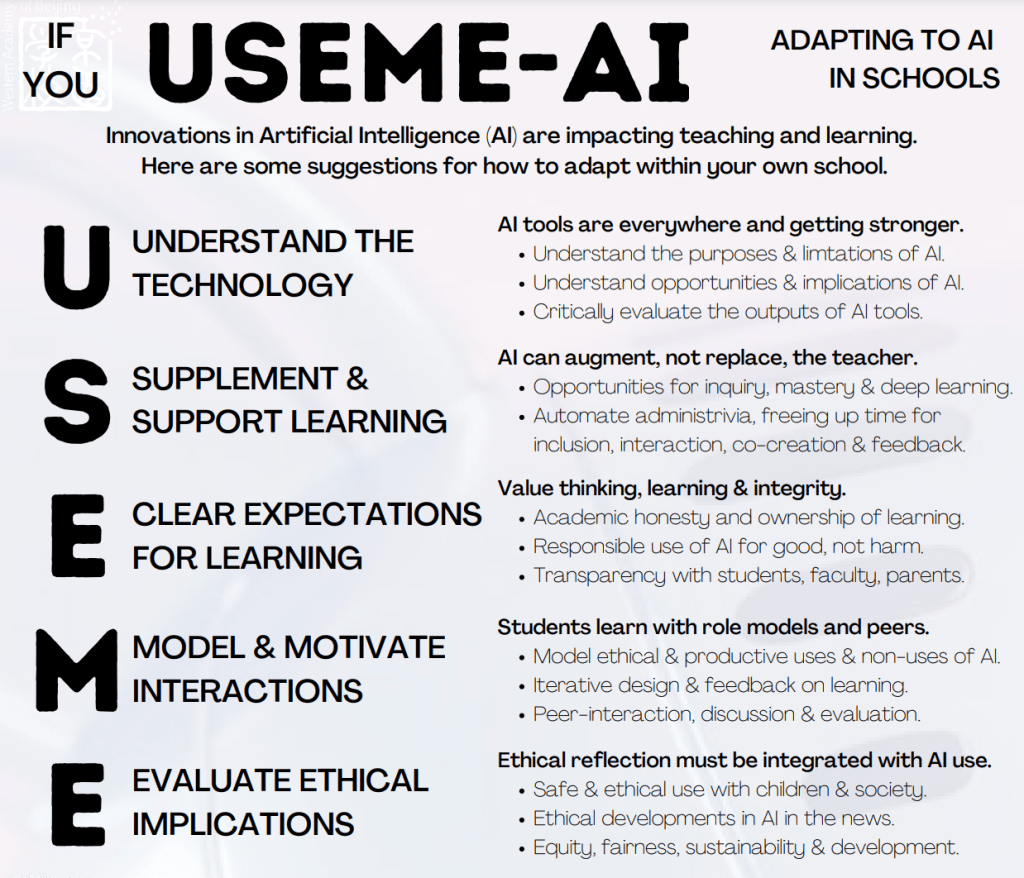 A quick post to share some updates to (If You) USEME-AI. In Dec’22, I created this possible outline for discussions around AI-related change in schools. Reflecting on our journey so far, it still holds pretty true, and this update includes some minor edits, including: