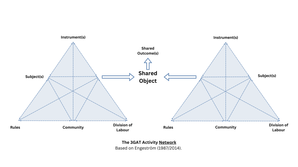 Now we go a step further, into 3GAT. AIEd and the development of learner agency are such complex, decentralised ideas that many activity systems might be working towards (or contesting) shared objects. This is where Engeström’s activity network comes in: