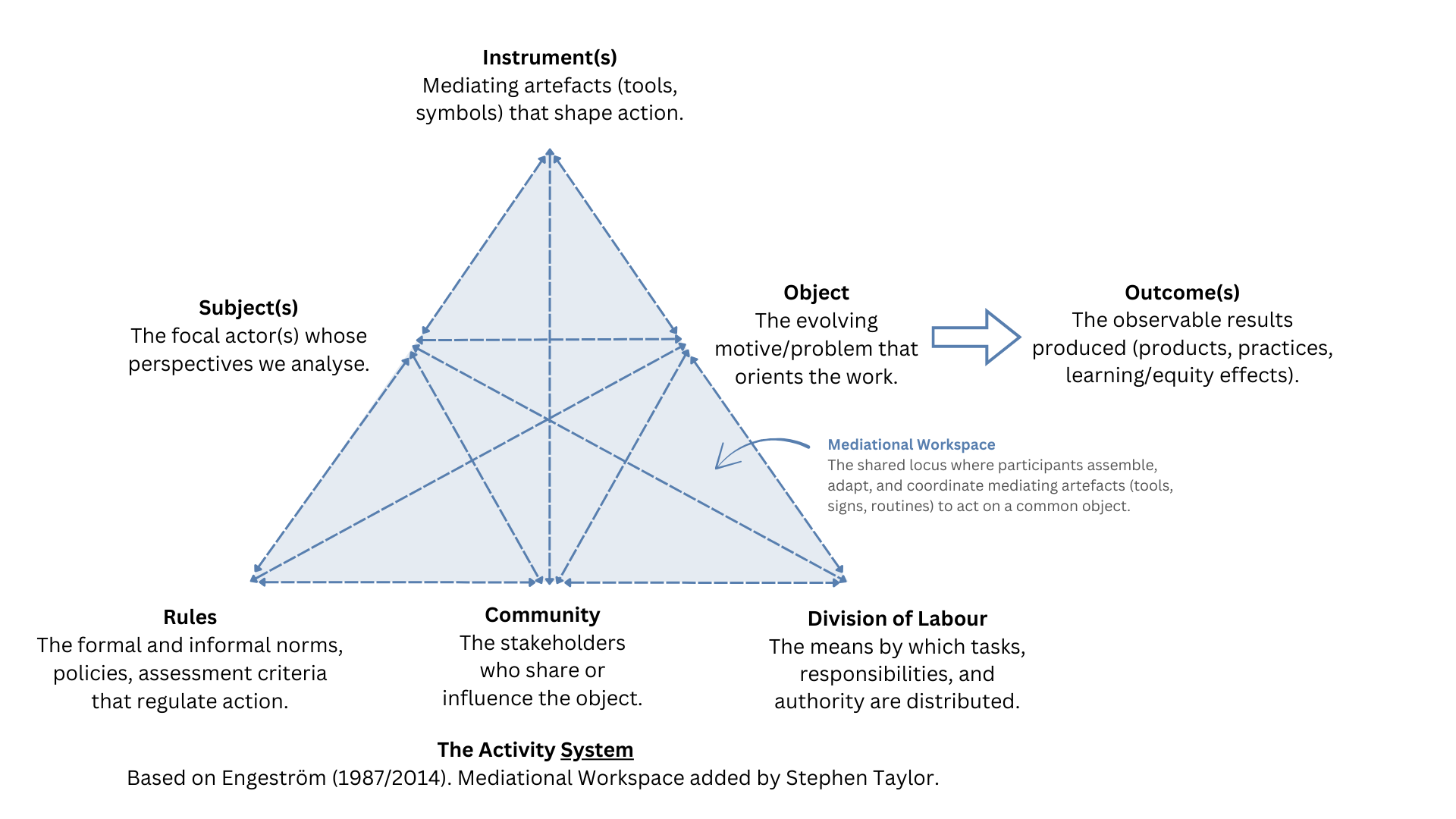 An activity system has six interacting nodes. See the adapted triangle, based on Engeström’s work below. I have added the label of mediational workspace to try to describe what happens within the triangle.