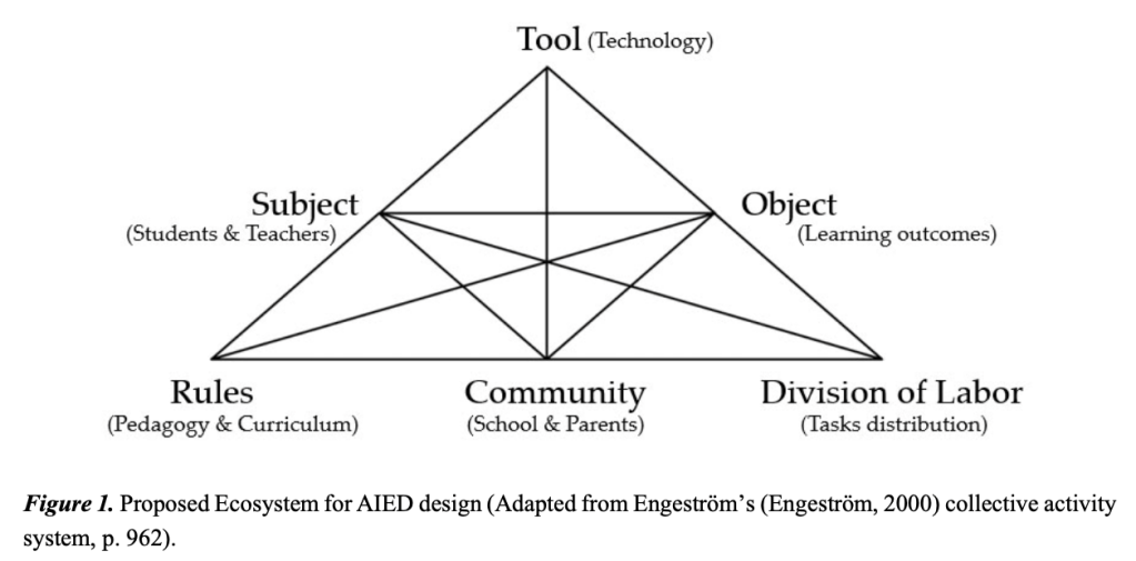 Although activity theory has been applied to computer-based learning (and even AI) since the 1980’s, the first example I can find of applying activity theory to current AIEd comes from Uden & Ching (2024). This paper is also well worth reading, and they present one approach in this diagram, proposing an ecosystem-based approach to AI adaptation.