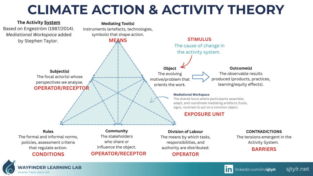 In an ideal “fit” between climate action and AIEd, schools and school systems would have more control and influence over the cause of change: AI development. Beyond what we allow through our doors and the lobbying influences of regulators, this is unlikely, so here we are. By shifting the framing of mitigation to that which is within our control, we can centre the threats and challenges posed by AI, and how to counter them. Using the concepts above (stimulus, exposure unit etc) or activity theory, or just by using Circle of Viewpoints or making a list of what we need to protect, we can get this done.