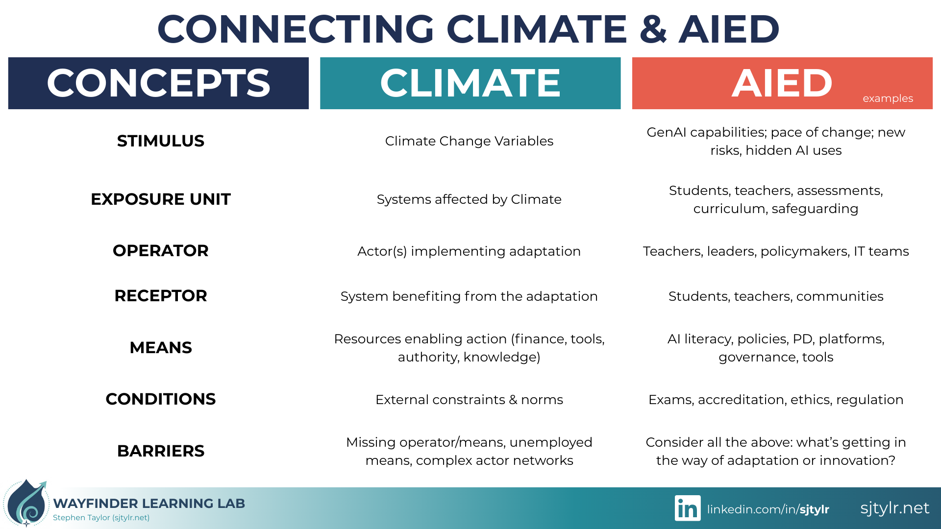 Both tools surface the complex interactions that AI can have across an (activity) system, and both could be used in considering the mapping of influences of or mitigations, adaptations and innovations to AI in the school context. Where activity theory surfaces contradictions of engines of change, climate adaptation helps identify barriers to making that change effective.