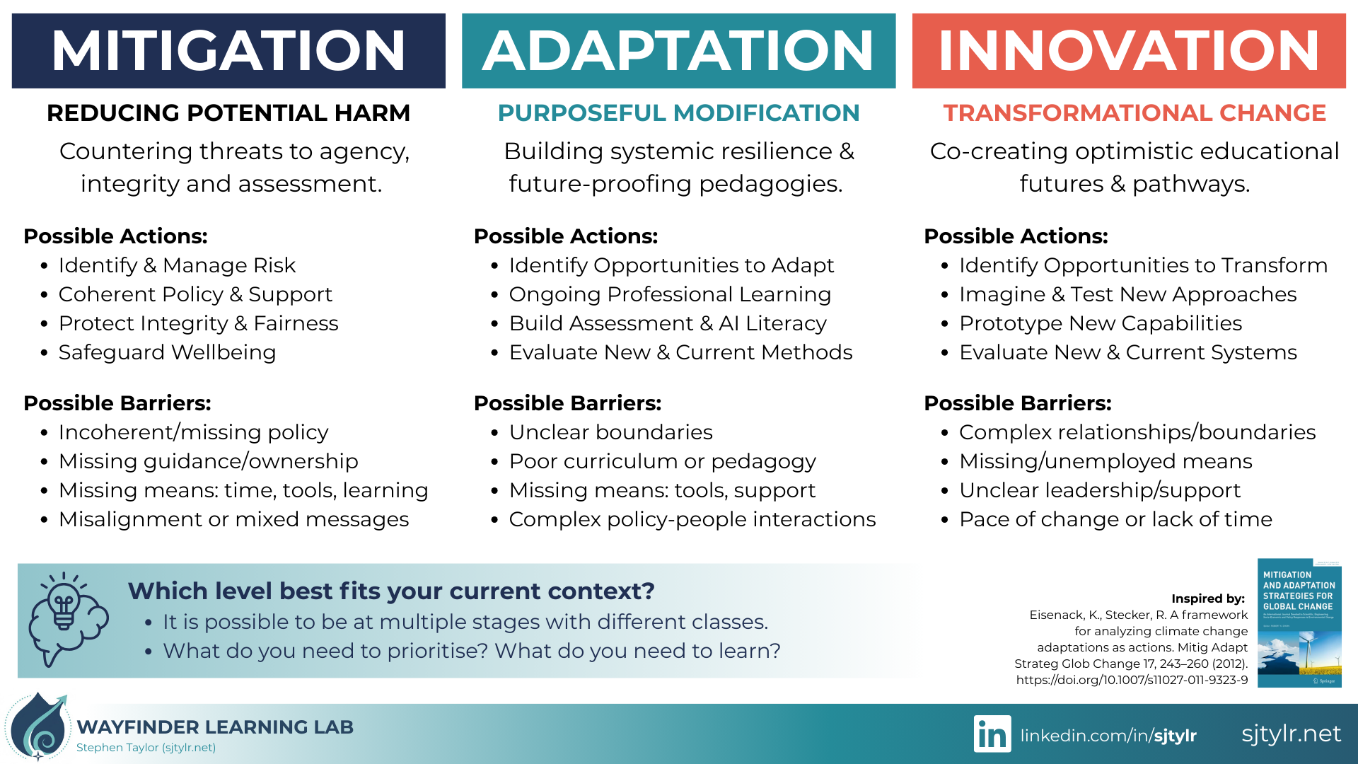 Over the last few years, I’ve been using the concepts of “Mitigation, Adaptation & Innovation” in response to GenAI in Education. This post goes back to Climate Action roots, to unpack the idea further. Key resources for this are Klaus Eisenack & Rebecca Stecker’s 2011 paper A framework for analyzing climate change adaptations as actions (DOI: 10.1007/s11027-011-9323-9) and the 2014 Denton et. al IPCC chapter Climate-Resilient Pathways: Adaptation, Mitigation, and Sustainable Development (link here).