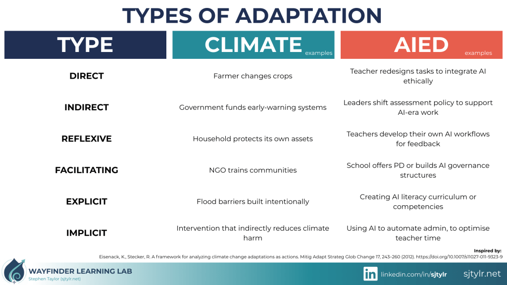 Adaptation is not as simple as making a change and hoping it works. Eisenack & Stecker and the IPCC make some useful distinctions between forms of adaptation. Again, shared here with an equivalent column of AIEd examples: