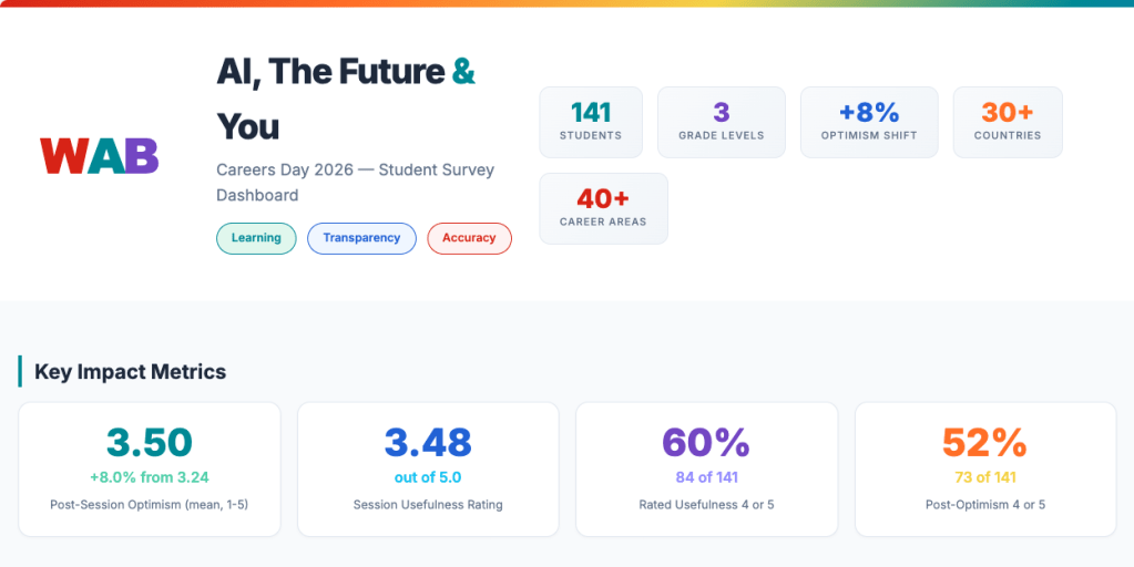 This morning, we ran a 2026 version of “AI, The Future & You” with Grade 9, 10 & 11 students as part of Careers Day. The original lesson was developed in 2023 for Grade 12 students and is on the AI Pedagogy Project site.