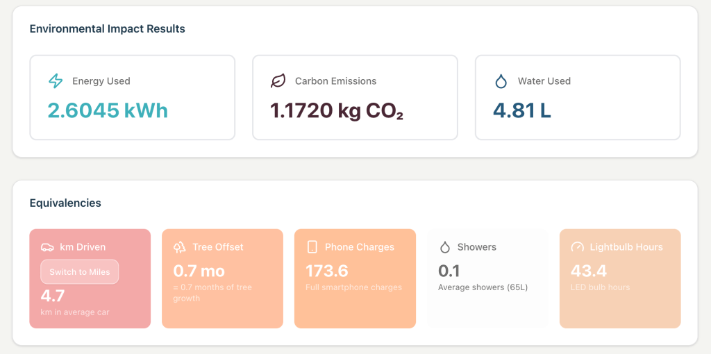 Overall, a noticeable, but not unreasonable impact, considering the value of the outputs. By removing extraneous use (images, video etc) and minimising interactions with AI, we were able to get valuable information in the hands of over 180 students in just 25 mins of laptop usage. For them to get the levels of detail and same number of resources each by themselves would take a long time and a lot of internet searching and computer use.