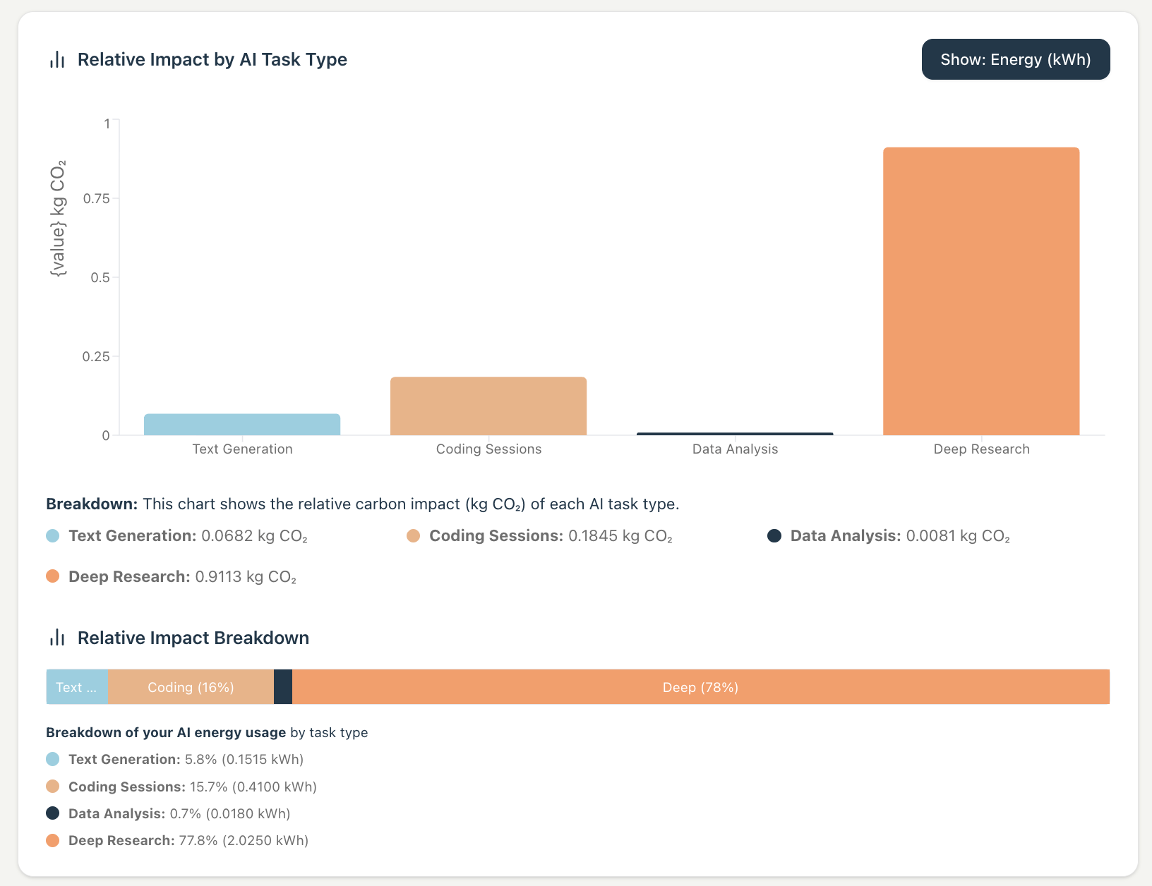 Using the AI Environmental Impacts Estimator, I estimated the following uses of AI, estimating upwards.