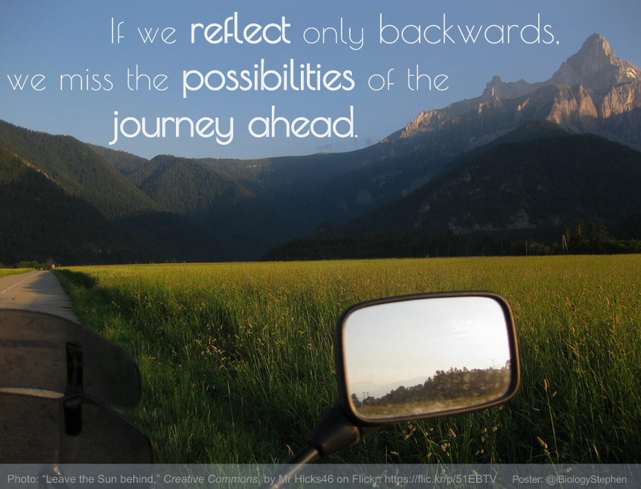 If we reflect only backwards, we miss the possibilities of the journey ahead. Original image on Flickr Creative Commons: https://flic.kr/p/51EBTVReally engaging with current issues in education – in particular assessment – is like taking the red pill in the Matrix, opening up a new world of challenges but ultimately improving (hopefully) practices.“I forgot the word I wanted to say, and thought, unembodied, returns to the hall of shadows.” OE Mandelstahm quote by Vygotsky.Image: ‘This is Sujatmi’ http://www.flickr.com/photos/95572727@N00/2726218408 Found on flickrcc.netI like this quote, and have it up in my lab. The photo is the roof of a temple nearby.